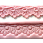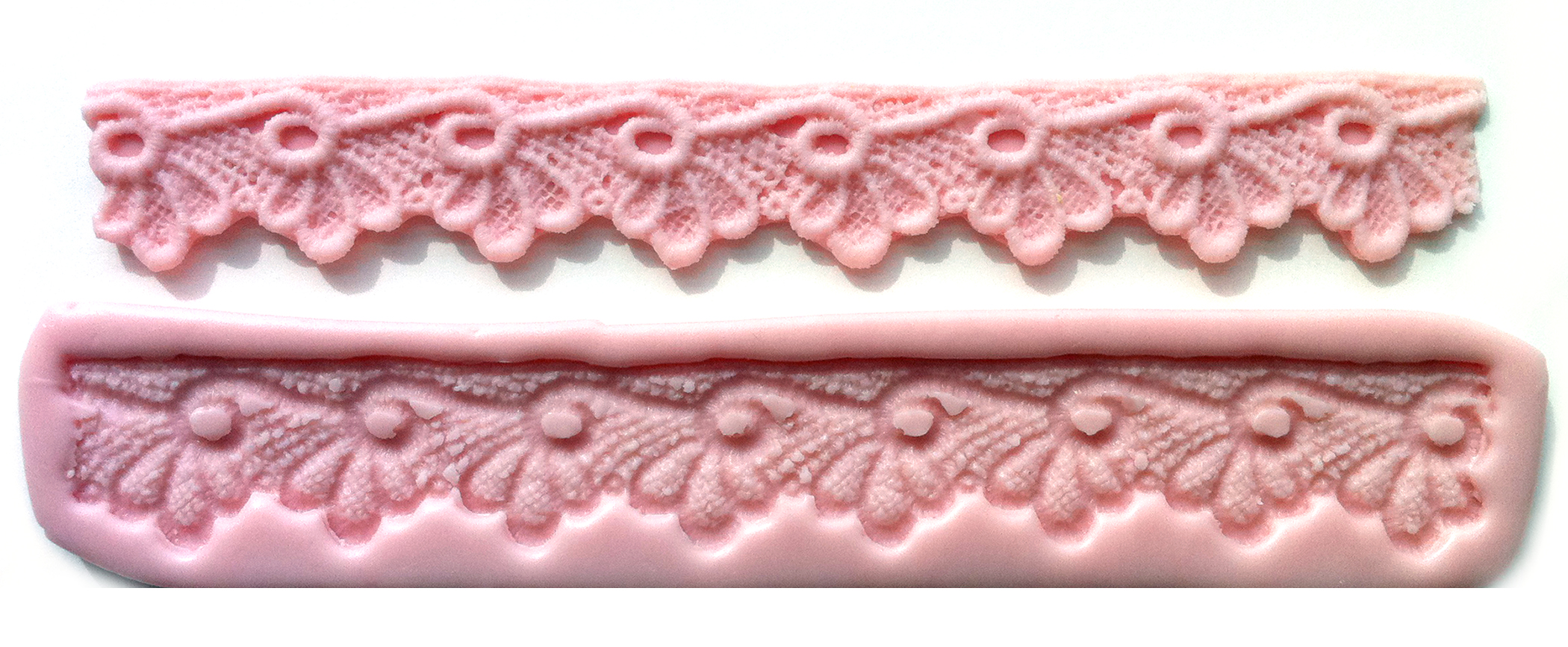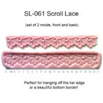 A meticulously detailed double-sided lace mold recreating a classic Belgian scroll lace design. It measures 8 inches long by 1 inches tall. Rollout dough out and lay over bottom. Press top mold onto it and then peel off the excess before removing. It is designed to be matched end-to-end for a continuous border.