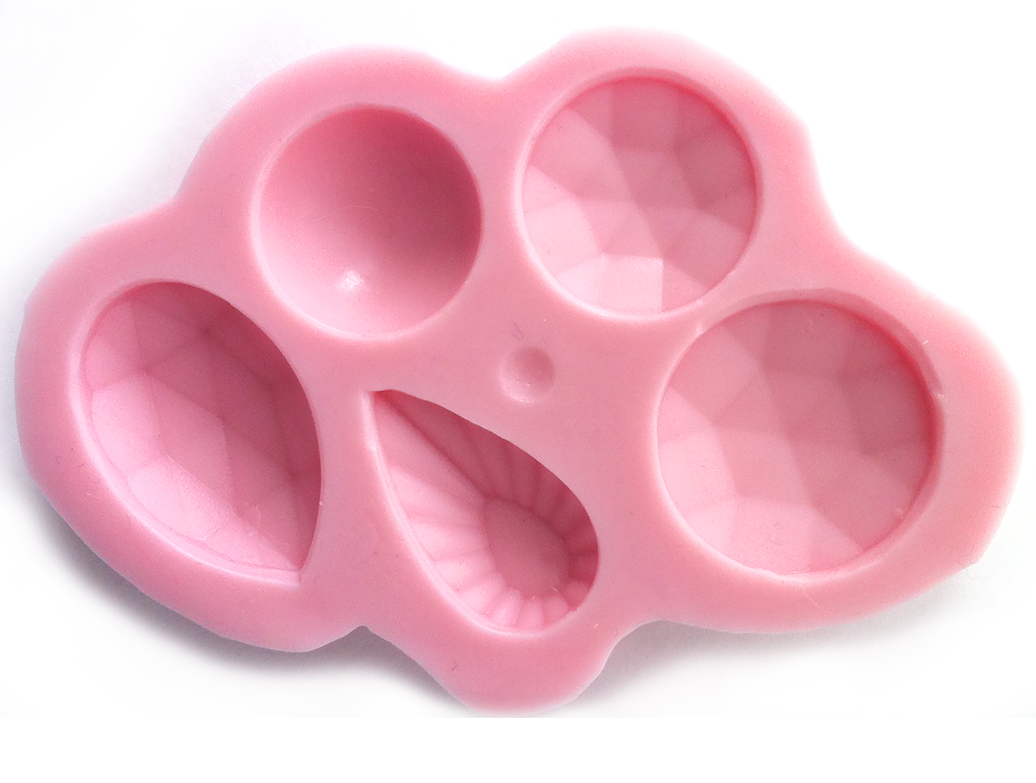 Contains five diamond shapes, four of which are faceted and one that is rounded. Each measures 1 inch (25 mm) across.